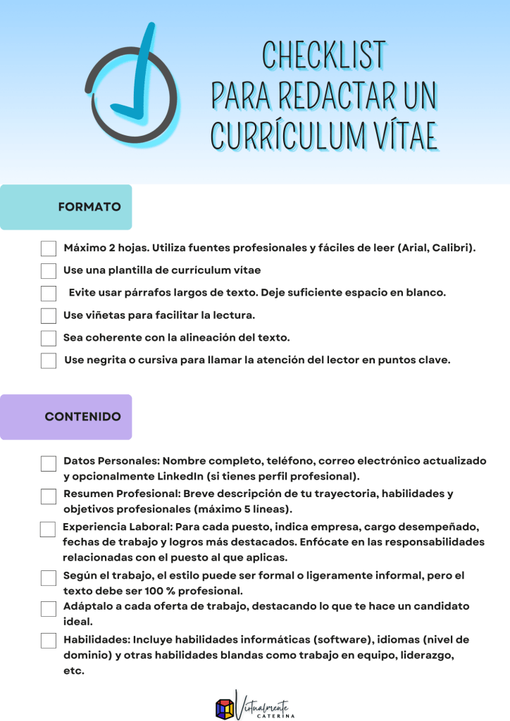 Esta lista te ayudará a redactar un currículum vítae completo, claro y que llame la atención del reclutador. Revisa cada punto antes de enviar tu CV a una oferta laboral.