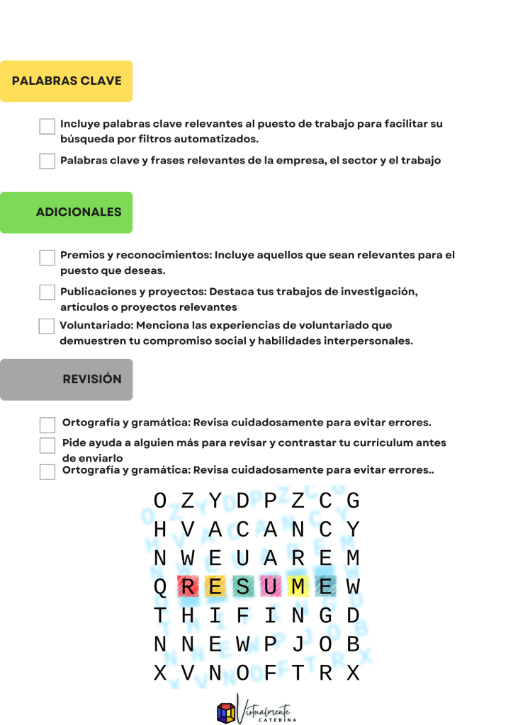 - Palabras clave: Utiliza palabras clave relevantes que se mencionan en la oferta de empleo para pasar los filtros de los sistemas de seguimiento de candidatos y llamar la atención de los reclutadores.