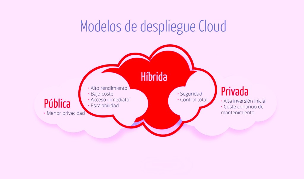 Como ya explicamos, puedes elegir entre nube pública, privada, híbrida o comunitaria. La elección dependerá del nivel de control, seguridad y presupuesto que tengas.