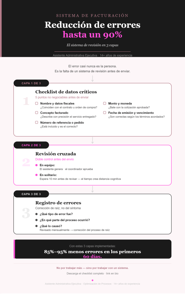 | Con estas 3 capas bien implementadas, los equipos reducen sus errores de facturación entre un 85% y 95% en los primeros 60 días. No por trabajar más — sino por trabajar con un sistema. |